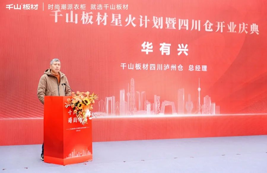 千山板材優秀經銷商代表,四川瀘州倉總經理華有興上臺致辭。華總分享到,在集團總部和區域合作伙伴的支持與努力下,千山板材在瀘州地區的市場占有率逐年攀升,品牌影響力日益增強。未來,將繼續加強合作,共同應對市場挑戰,實現互利共贏。
