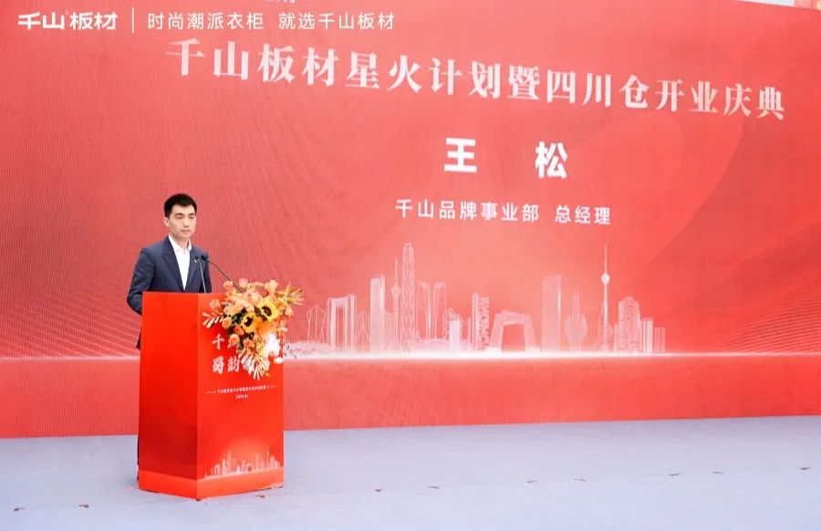 千山品牌事業部總經理王松發表致辭。王總表示,四川倉的開業,是繼山東倉之后,千山板材發展歷程中又一重要的里程碑,也是千山板材在四川發展的全新起點。千山將以此為契機,加強與四川區域所有合作伙伴的溝通與合作,實現品牌和銷量的雙提升。