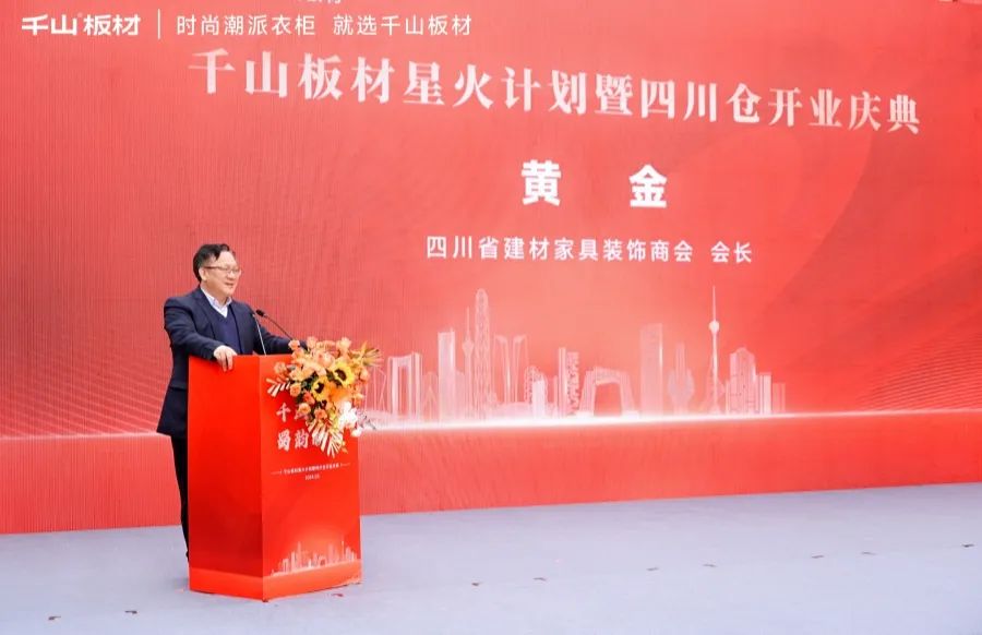 四川省建材家具裝飾商會會長黃金先生發表致辭。黃會長表達了對千山板材四川倉的美好期許和祝愿,并表示四川家具市場的繁榮與發展,離不開千山板材等一眾優秀供應鏈品牌的入駐與支持,也希望四川倉合力共上,迎來高質量發展。