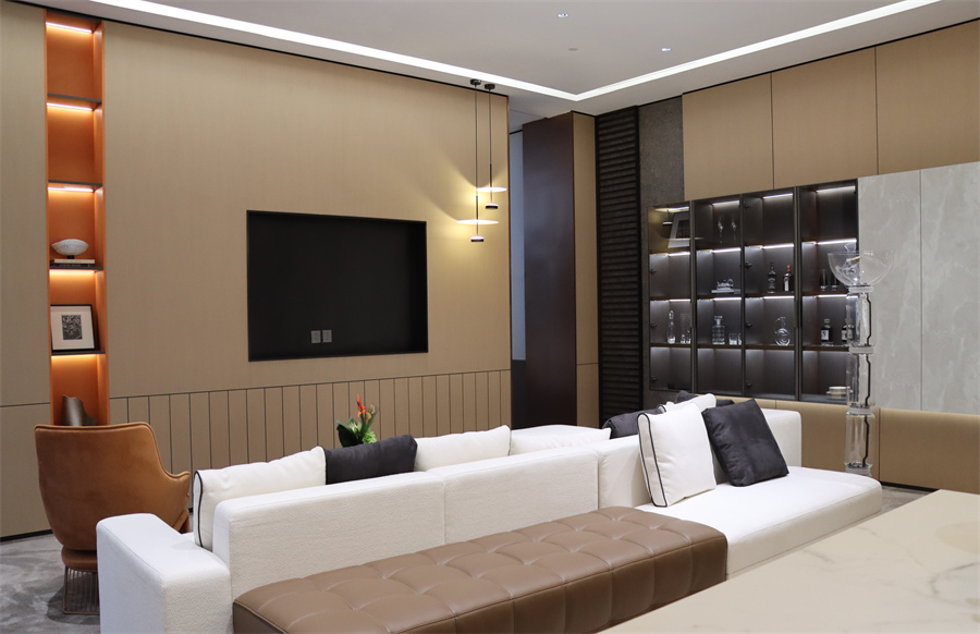 展廳五大空間呈現現代極簡、現代輕奢、新中式三大主流家裝風格,采用千山板材四大品類,糅合六大系列花色:木紋系列、純色系列、石紋系列、同步系列、數碼系列、PET系列,演繹多元化生活場景。