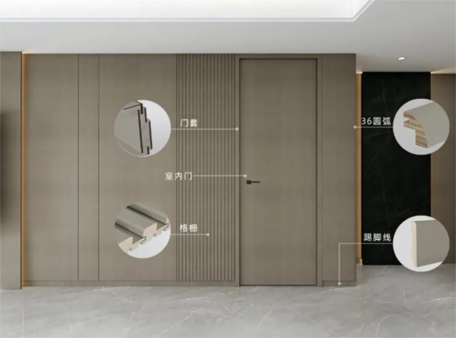 門(mén)墻柜系統(tǒng)涵蓋板材、室內(nèi)門(mén)、圓弧、實(shí)木格柵、埡口、門(mén)套線(xiàn)、踢腳線(xiàn),打通23款花色,材質(zhì)、色彩統(tǒng)一,實(shí)現(xiàn)門(mén)墻柜全屋同色一體。