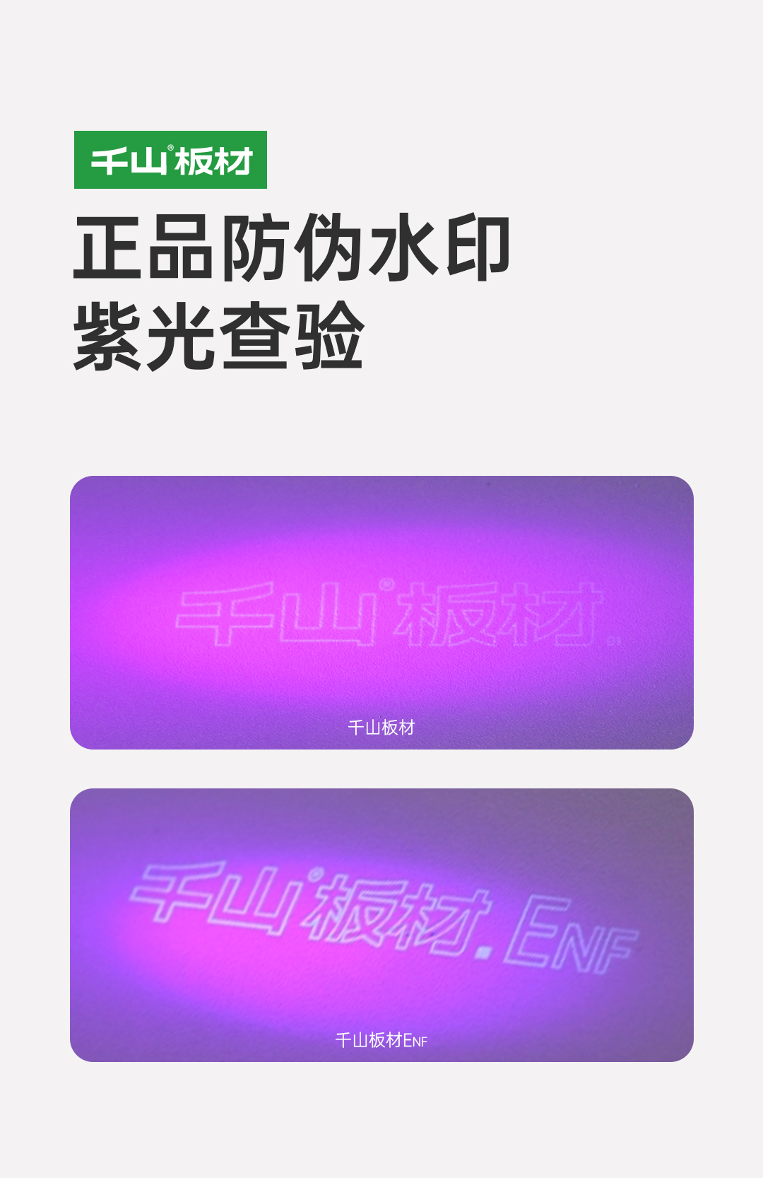 正品千山板材表面都印有隱形防偽標識,使用紫光手電筒照射板材表面,顯現“千山板材” 或 “千山板材ENF”水印,凈醛板顯現“凈醛 抗菌 抗病毒”水印。