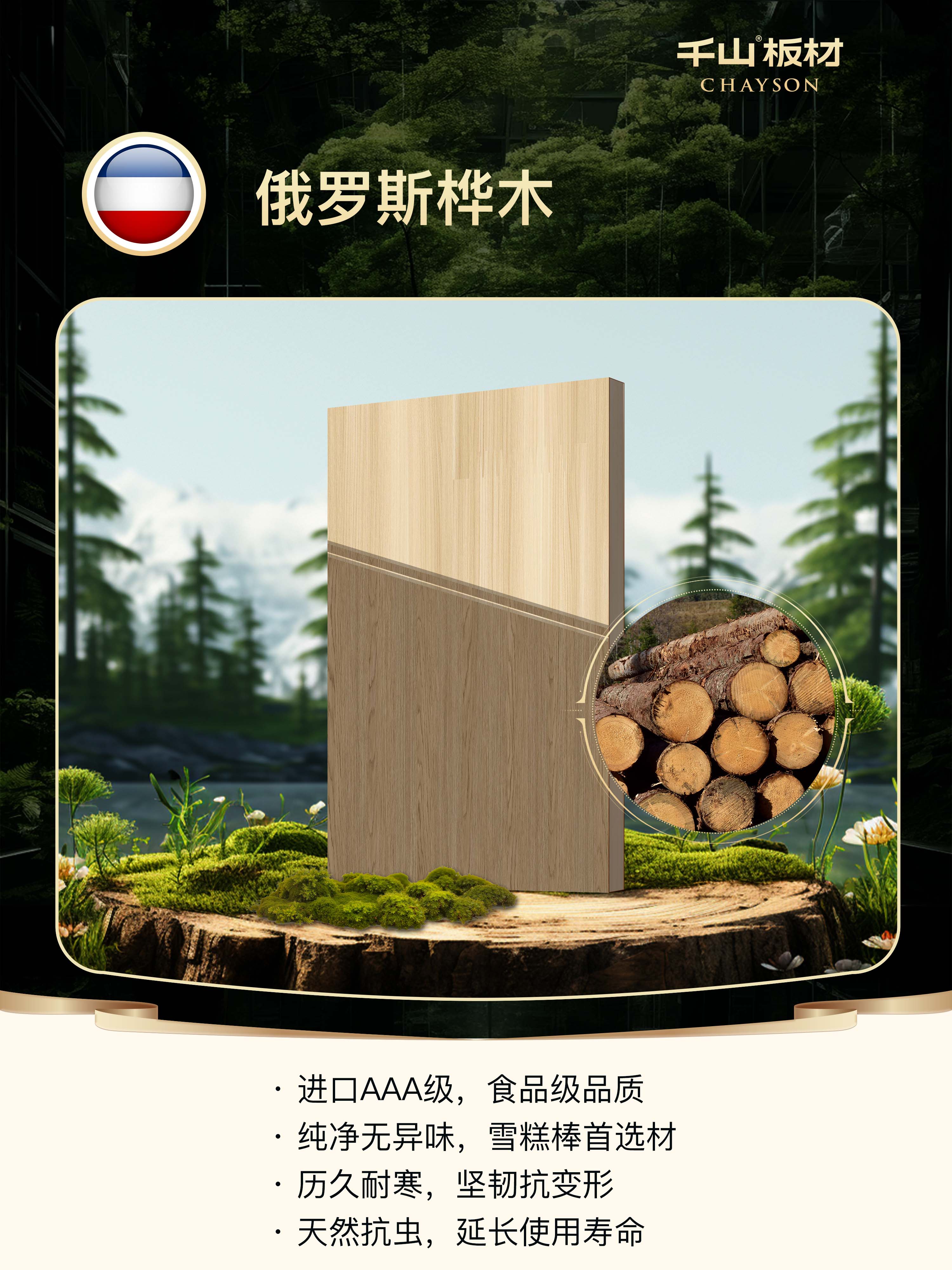 俄羅斯樺木生長(zhǎng)在寒冷的環(huán)境中,具有更高的密度和硬度,結(jié)構(gòu)致密、材質(zhì)堅(jiān)韌,是制作雪糕棒、木砧板等食品用材的理想材料,健康且耐磨耐用。